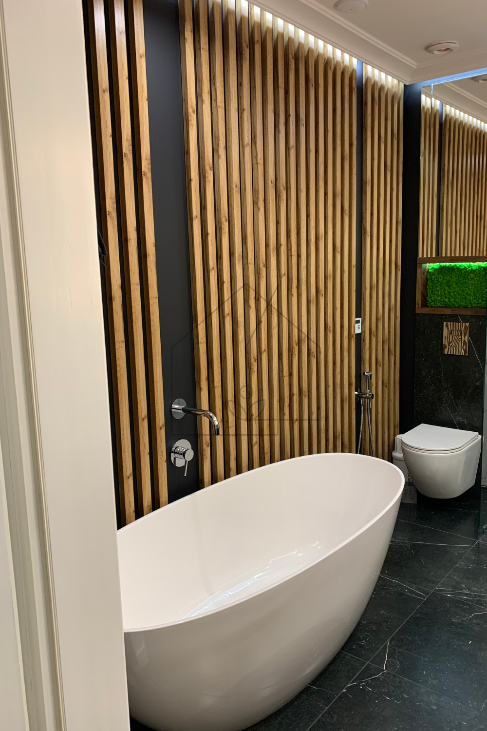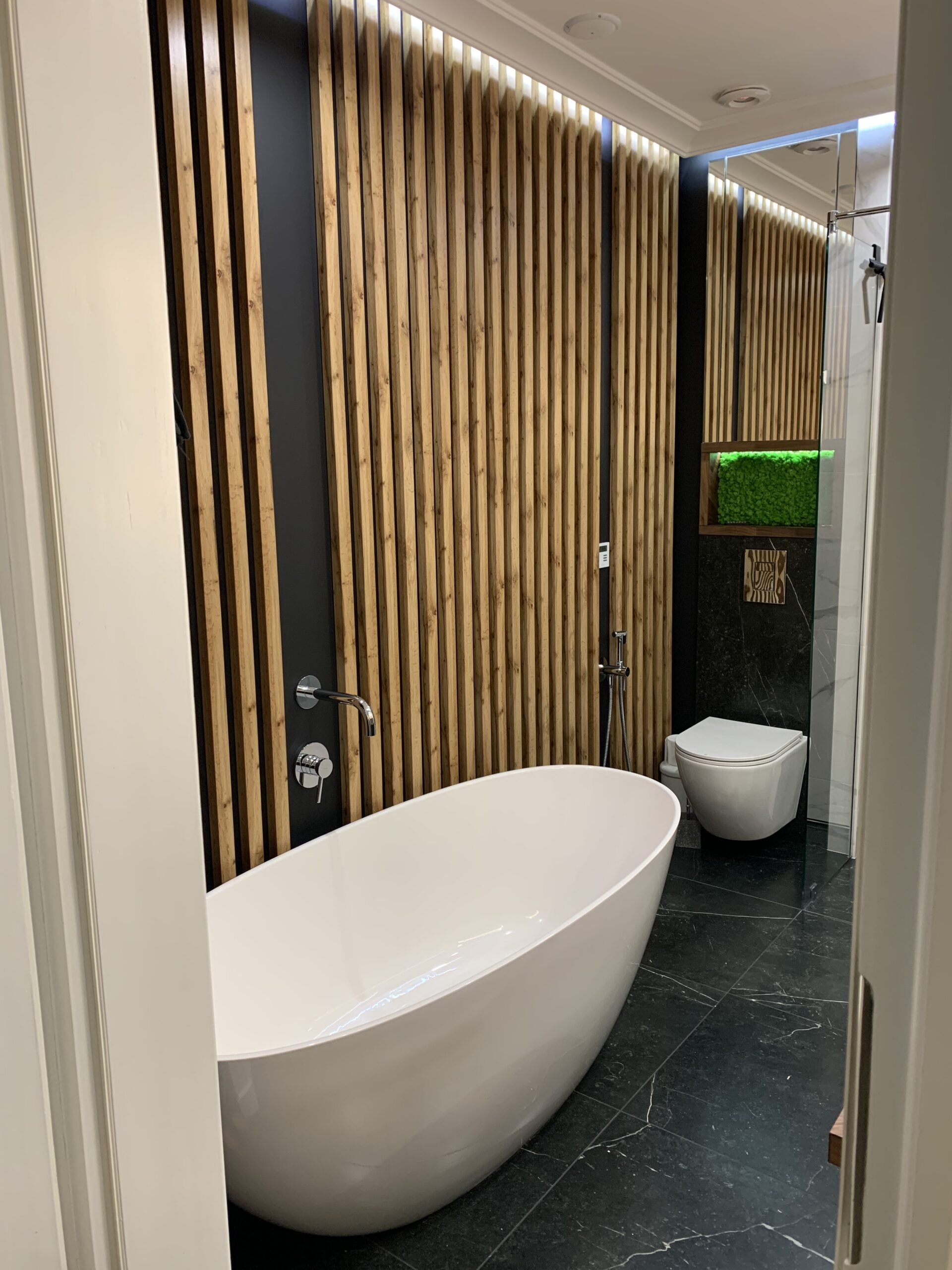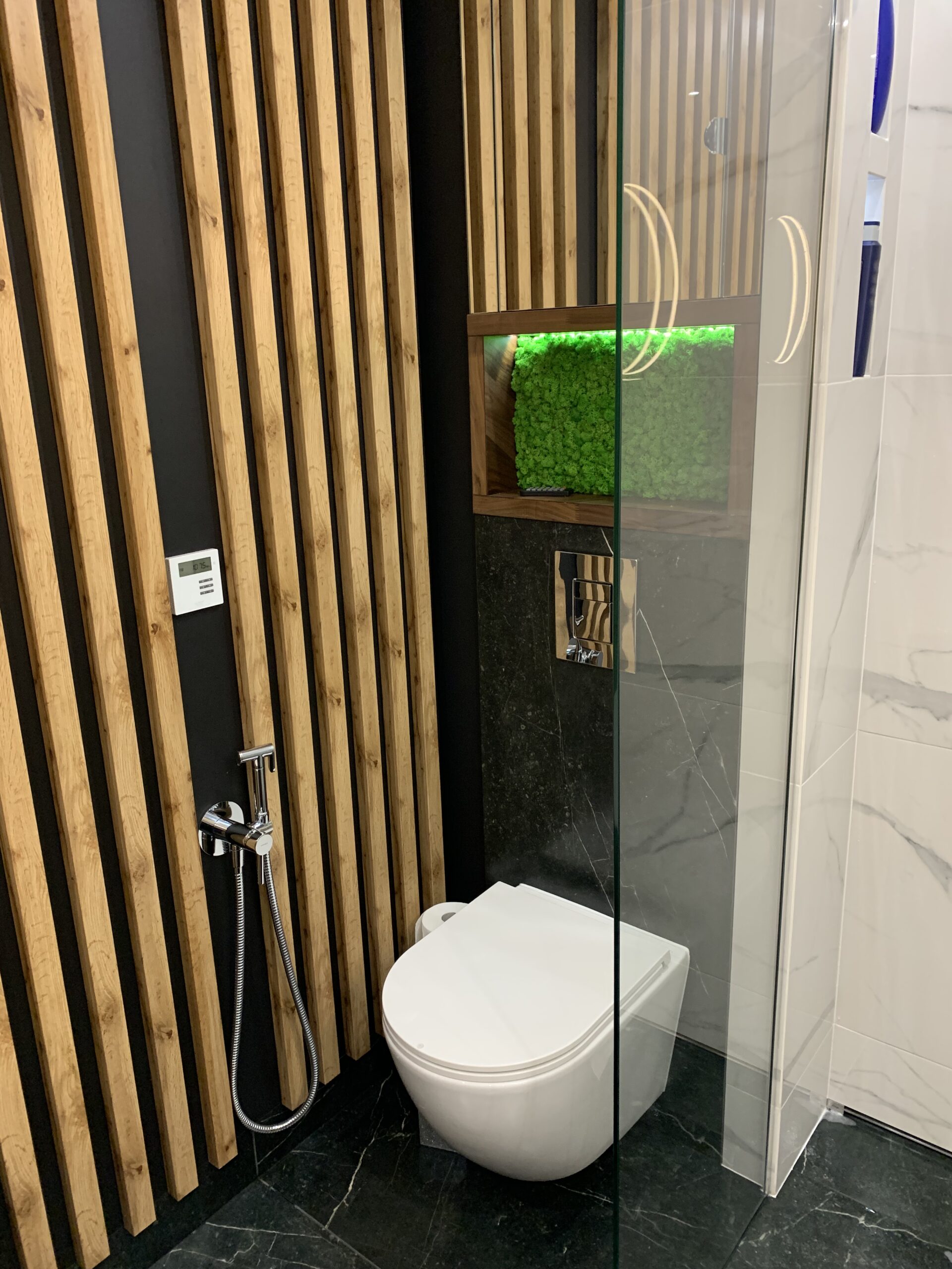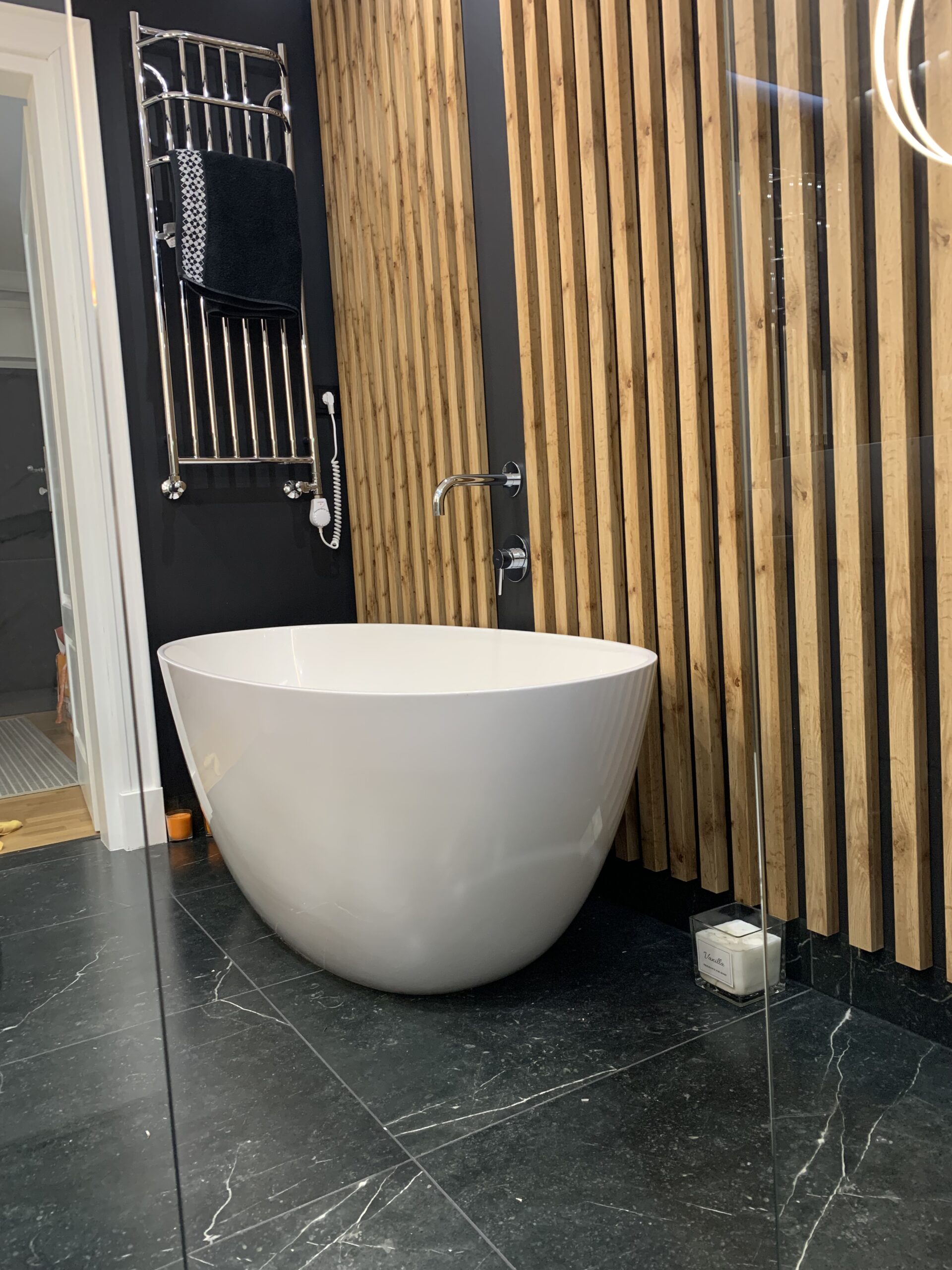 W niewielkim mieszkaniu o powierzchni 80 m2 mieszka czteroosobowa rodzina z jedną łazienką, a każdy z jej członków miał swoje marzenia dotyczące tego pomieszczenia; jedno z nich pragnęło prysznica, inne zaś wanny, chociaż przestrzeń nie pozwoliła na umieszczenie bidetu, projekt łazienki zaspokoił pośrednio i to oczekiwanie, oferując inteligentne rozwiązania, które maksymalizują dostępność i funkcjonalność. Dzięki naszym staraniom, przestrzeń łazienkowa nie tylko optycznie się powiększyła, ale również znacznie poprawił się komfort użytkowania wszelkich sanitariatów, co przekłada się na codzienną wygodę. Łazienka, choć spełnia swoją podstawową funkcję, została zaprojektowana z dbałością o detale, co czyni ją nie tylko praktycznym miejscem, ale również eleganckim akcentem w stylu spa, wprowadzającym w domową atmosferę relaksu i harmonii.