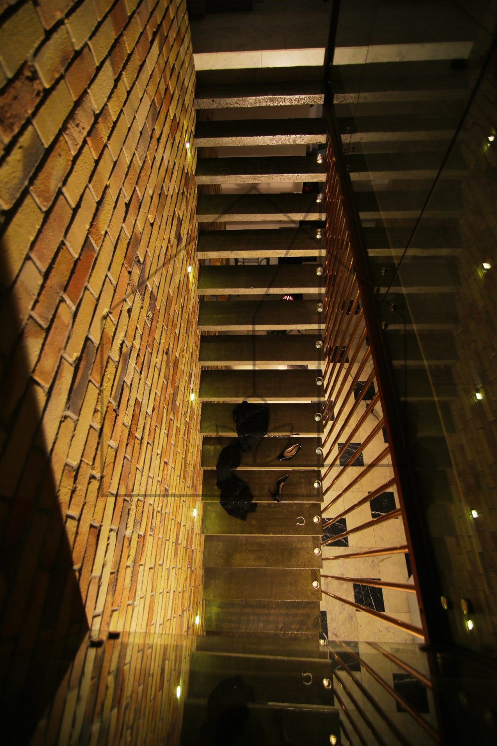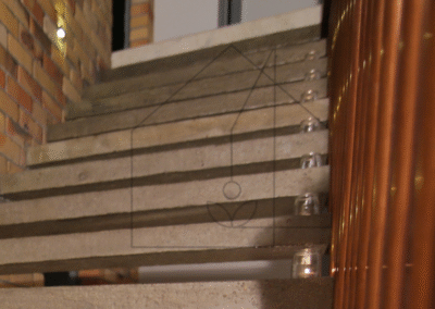 Na pewien efekt wizualny warto pracować dużo wcześniej, niż by się mogło wydawać. Schody bez podstopnic wymagają ukrycia konstrukcji w ścianie, tak by pozostawało wrażenie wyrastania podstopnic ze ściany. Surowy beton zabezpieczony żywicą staje się nie tylko wygodnym w użytkowaniu materiałem wykończeniowym a także charakterystycznym elementem całego wnętrza. Uroku dodaje mu tło ze starej porozbiórkowej żółtej cegły oraz balustrada z rur miedzianych, która dopełnia konstrukcję jak biżuteria. Dzięki temu zastosowaniu, beton, cegła i miedź – materiały naturalnie kojarzące się z chłodem – nabierają ciepła. Projekt ten to nasz kolejny doskonały przykład filozofii oszczędności w zastosowaniu materiałów oraz niespotykanej wręcz ponadczasowości i długowieczności. Dobór materiałów stanowi zawsze modną historię. Dzięki temu willa pod Warszawą zyskała świeży powiew nowoczesności i charakteru, stając się świadectwem naszej troski o długowieczność i bezobsługowość, a tym samym komfort użytkowników.