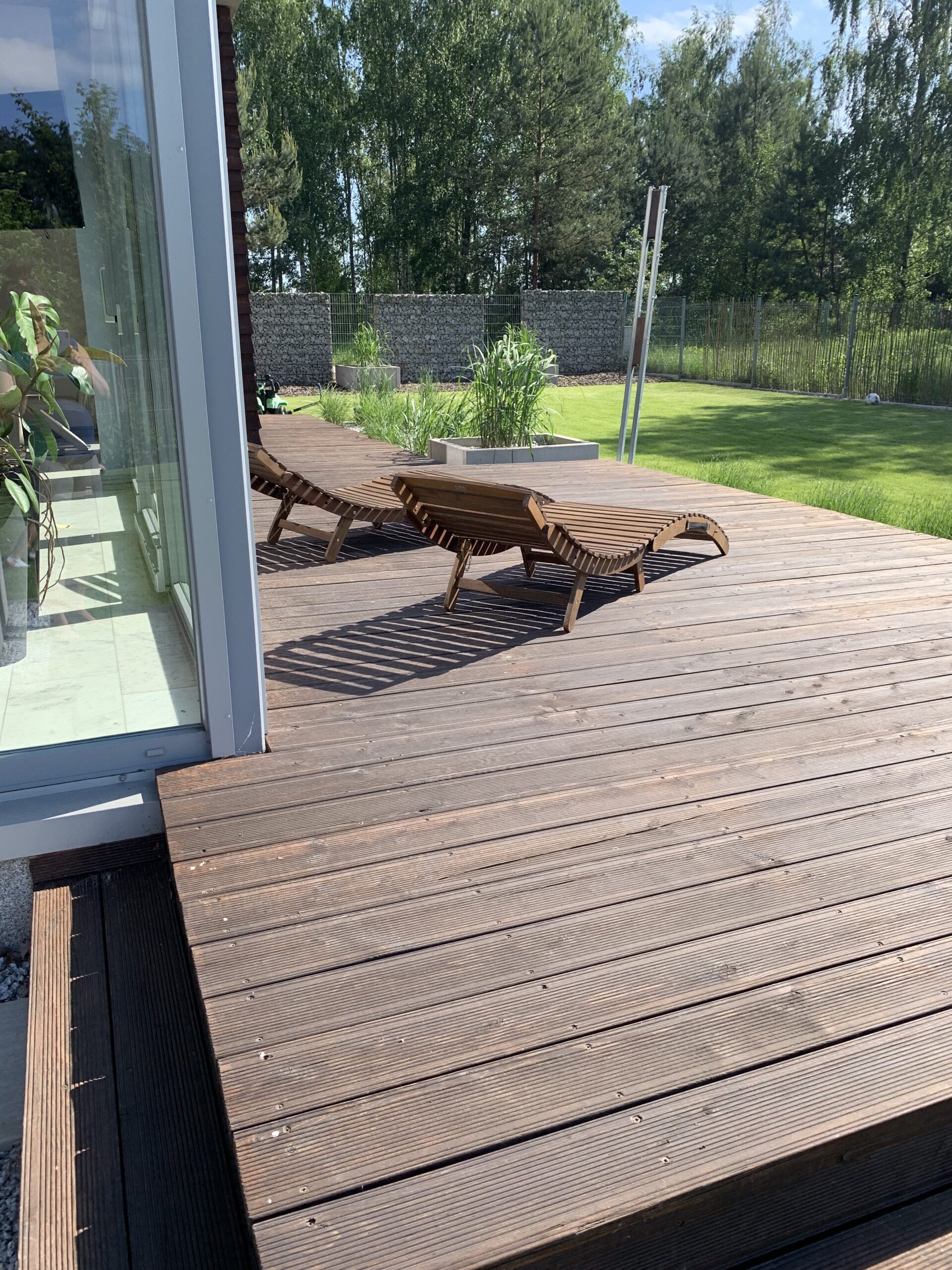 W pięknej willi pod Warszawą znalazło sie miejsce na piekny prosty w formie taras z desek z modrzewia syberyjskiego.